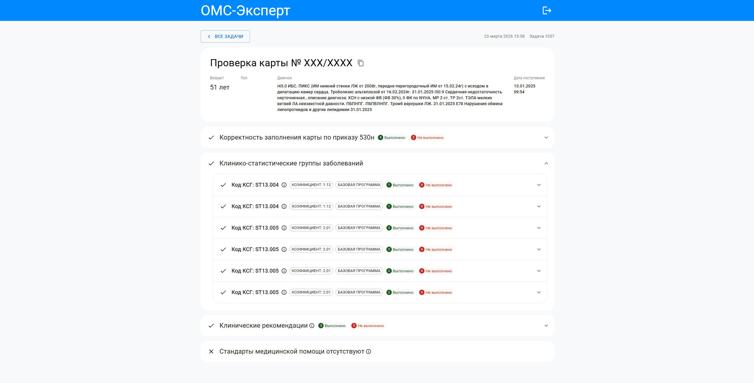 - Оценка карты на выполнение стандартов оказания медицинской помощи